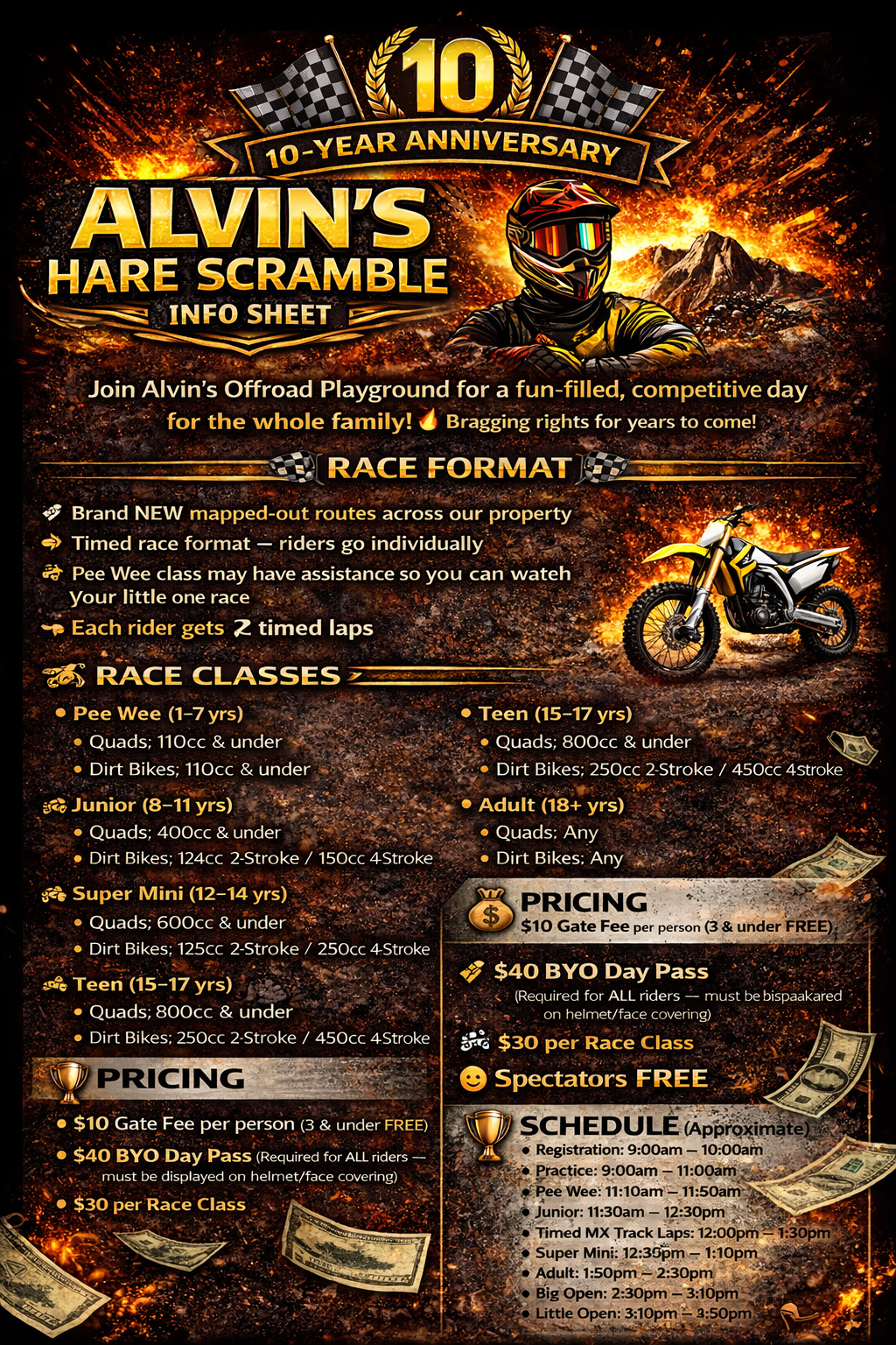 Secure your spot now and make unforgettable memories at Alvin’s Offroad Playground.